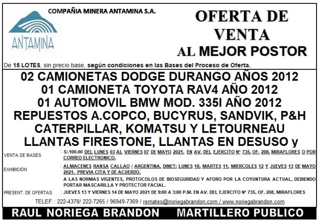 OFERTA DE VENTA AL MEJOR POSTOR – COMPAÑÍA MINERA ANTAMINA S.A – LUNES 17 DE MAYO Maquinarias, VehículosPor noriegabrandon29 de abril de 2021ANEXO 1 LISTADO DE LOTES OFERTA DE VENTA AL MEJOR POSTOR DE 15 LOTES