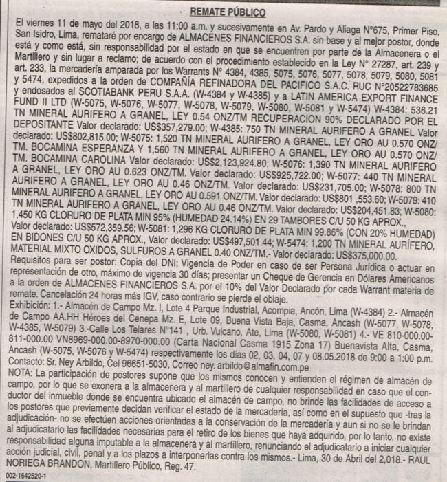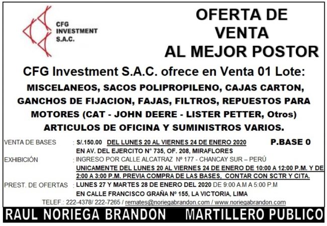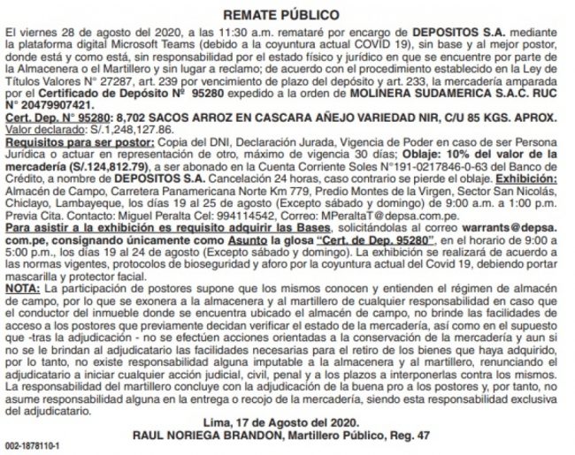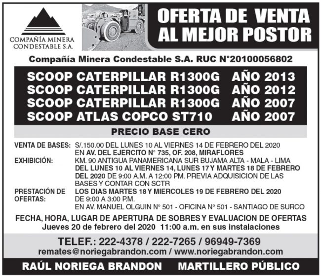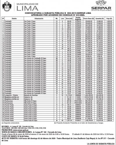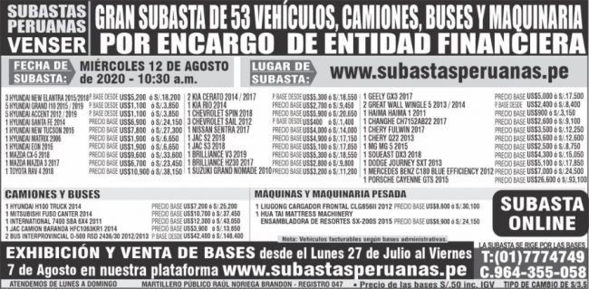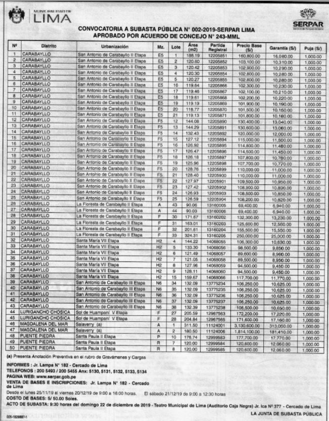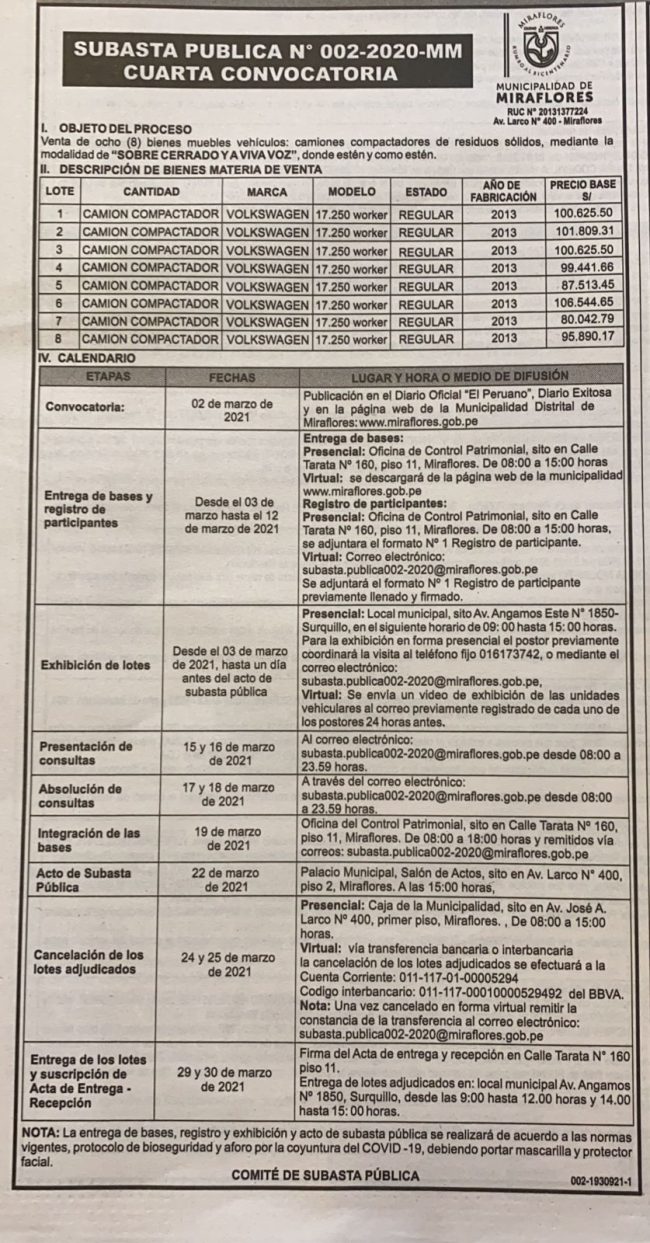 SUBASTA PUBLICA DE OCHO COMPACTADORAS POR CUENTA DE LA MUNICIPALIDAD DE MIRAFLORES DIA LUNES 22 DE MARZO DEL 2021 HORA: 3:00 P.M. ENTREGA DE BASES Y REGISTRO DE PARTICIPANTES: EL MIERCOLES 03 AL VIERNES 12 DE MARZO EXHIBICION DE LOTES DEL 03 DE MARZO HASTA UN DIA ANTES DEL ACTO DE SUBASTA