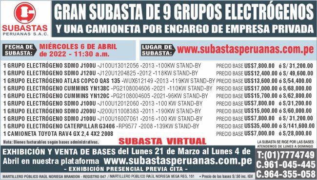 GRAN SUBASTA ELECTRONICA DE 09 GRUPOS ELECTROGENOS Y 01 CAMIONETA TOYOTA RAV4 AÑO 2008 MIERCOLES 06 DE ABRIL DEL 2022 HORA 11:30 A.M.