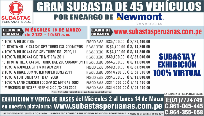 GRAN SUBASTA ONLINE DE 45 VEHICULOS POR ENCARGO DE MINERA YANACOCHA DIA MIERCOLES 16 DE MARZO 2022 – 10:30 A.M.