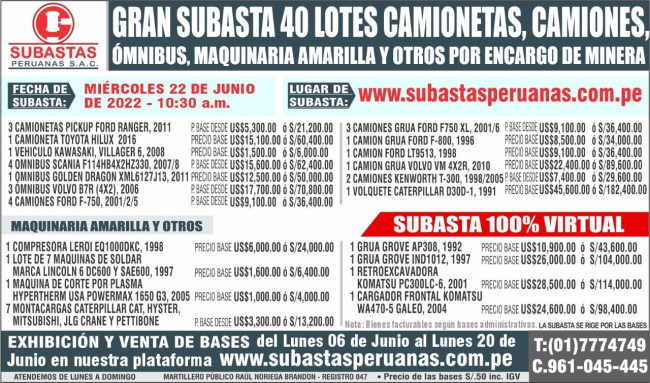 GRAN SUBASTA ELECTRONICA DE 40 LOTES: CAMIONETAS, CAMIONES, OMNIBUS, MAQUINARIA AMARILLA Y OTROS POR ENCARGO DE MINERA MIERCOLES 22 JUNIO A LAS 10:30 A.M.