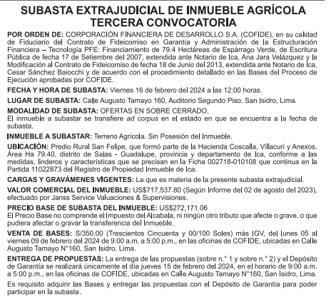 SUBASTA EXTRAJUDICIAL DE INMUEBLE AGRICOLA TERCERA CONVOCATORIA – VIERNES 16 DE FEBRERO DEL 2024 A LAS 12:00 HORAS