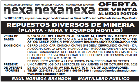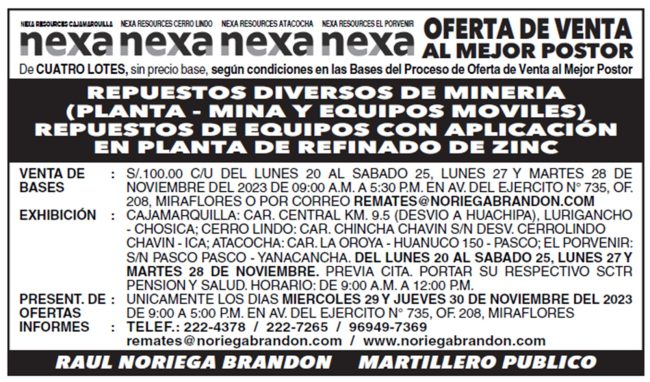 OFERTA DE VENTA AL MEJOR POSTOR NEXA RESOURCES CAJAMARQUILLA S.A. VIERNES 20 OCTUBRE 2023