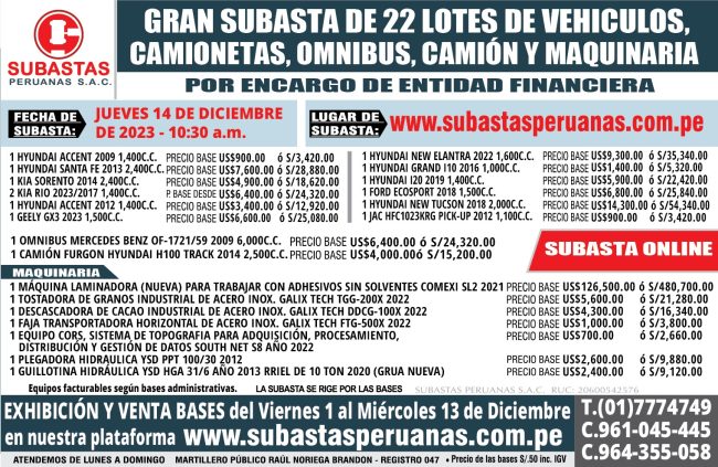 GRAN SUBASTA DE VEHICULOS Y EQUIPOS INDUSTRIALES – MIERCOLES 07 DE MAYO DEL 2025 – 10:30 A.M. DAR CLICK PARA ACCEDER A LA COMPRA DE BASES https://www.subastasperuanas.com.pe/