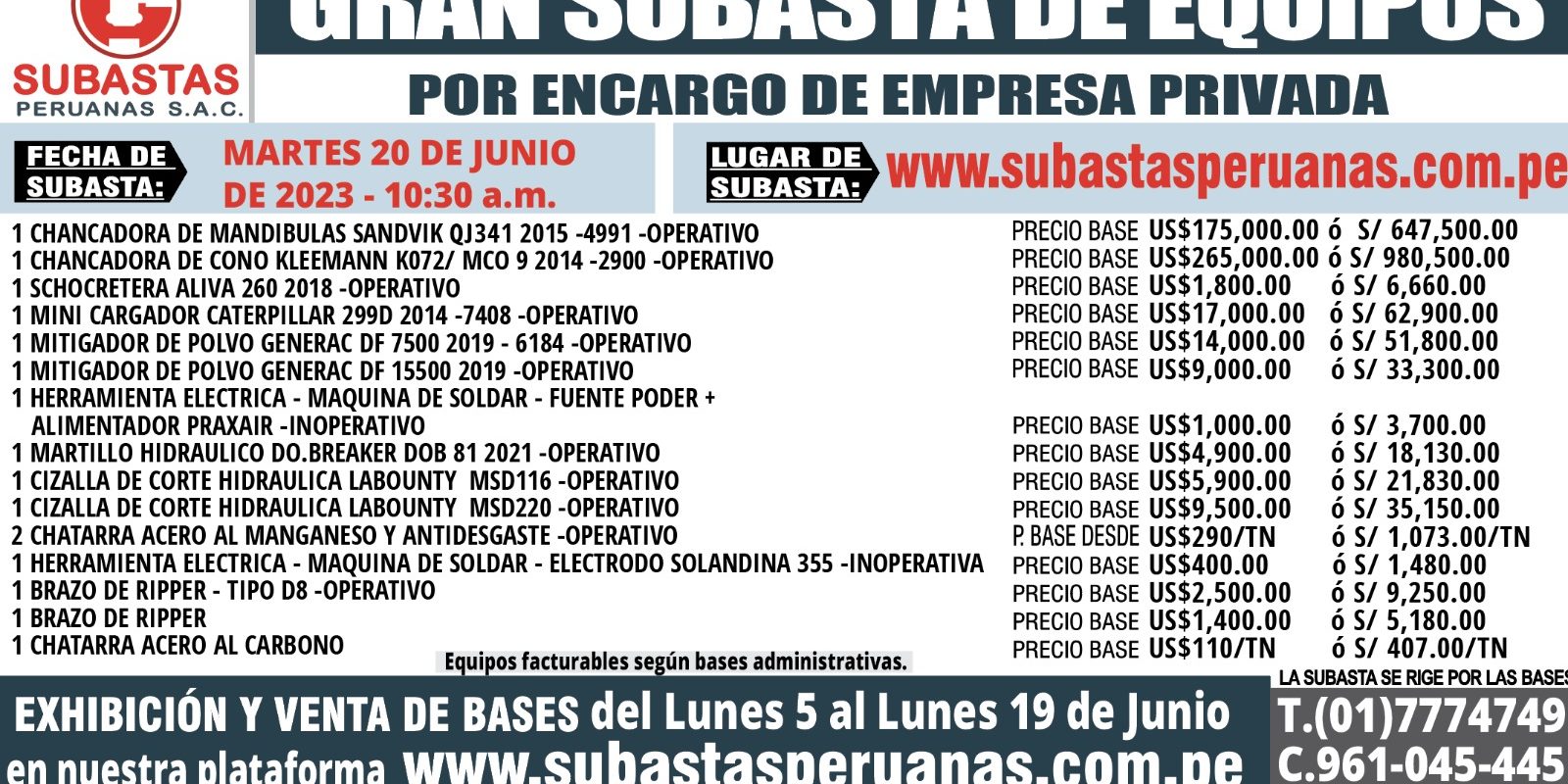 GRAN SUBASTA DE EQUIPOS POR ENCARGO DE EMPRESA PRIVADA – MARTES 20 DE JUNIO – 10.30 AM