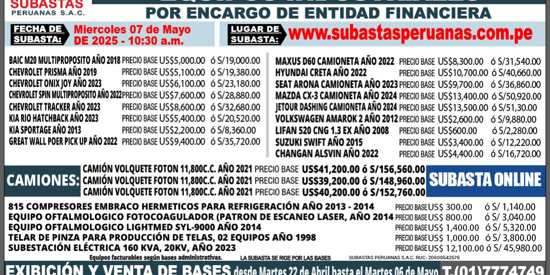 GRAN SUBASTA DE VEHICULOS Y EQUIPOS INDUSTRIALES – MIERCOLES 07 DE MAYO DEL 2025 – 10:30 A.M.