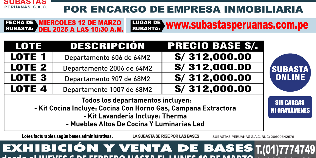 GRAN SUBASTA ELECTRONICA DE 04 DEPARTAMENTOS DE ESTRENO EN BREÑA – MIERCOLES 12 DE MARZO A LAS 10:30 A.M.