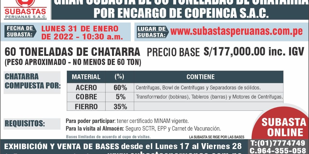 GRAN SUBASTA ELECTRONICA DE 60 TONELADAS APROX. DE CHATARRA
