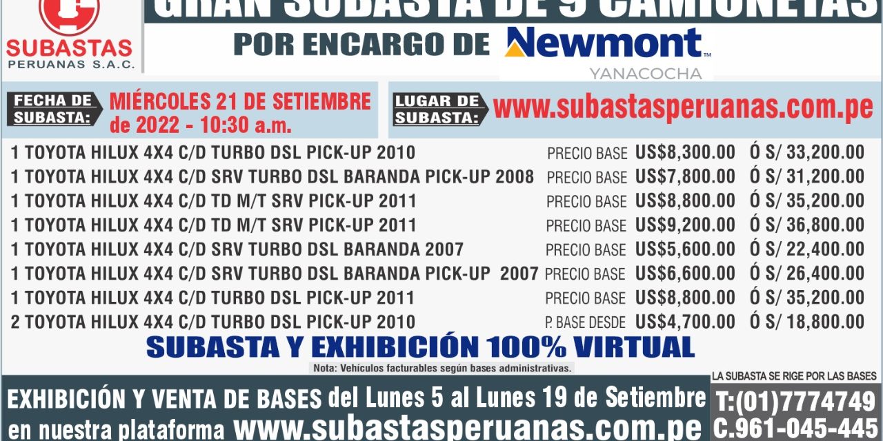GRAN SUBASTA ONLINE DE 09 VEHICULOS – POR ENCARGO DE MINERA YANACOCHA – DIA MIERCOLES 21 DE SETIEMBRE 2022 – 10:30 A.M.
