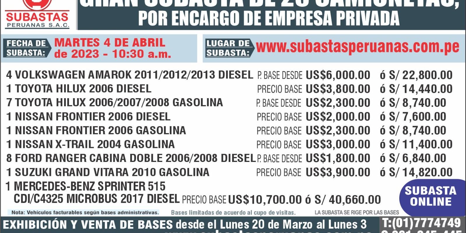 GRAN SUBASTA DE 20 CAMIONETAS, AMBULANCIA Y EQUIPOS MINEROS – MIERCOLES 17 DE SETIEMBRE 2025 A LAS 12:00 HRS.5 de septiembre de 2025
