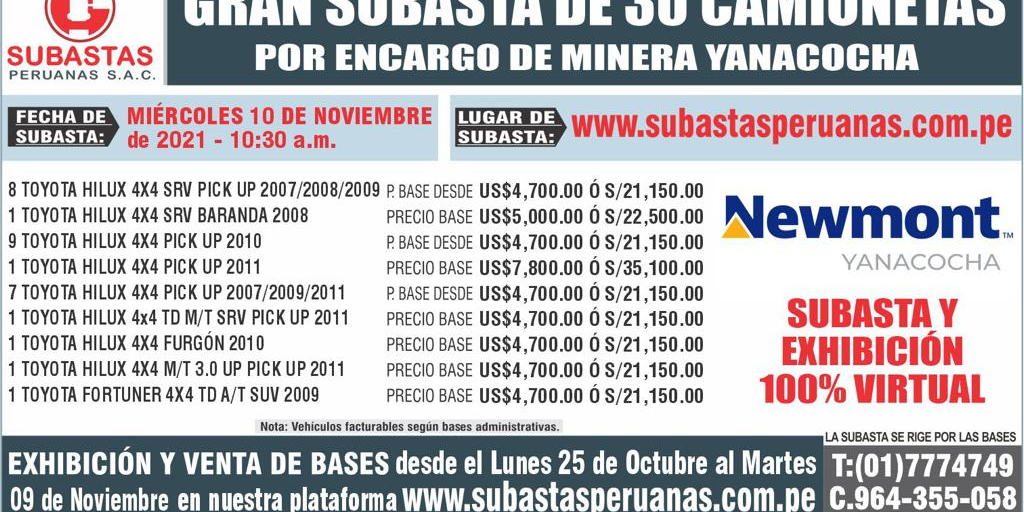 GRAN SUBASTA DE 20 CAMIONETAS, AMBULANCIA Y EQUIPOS MINEROS – MIERCOLES 17 DE SETIEMBRE 2025 A LAS 12:00 HRS.5 de septiembre de 2025