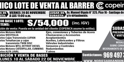 VENTA DE BASES : Del lunes 10 al viernes 21 de Noviembre del 2025, de 9:00 a 1:00 p.m. y 2:00 a 5:00 p.m. a través del WhatsApp 969497369