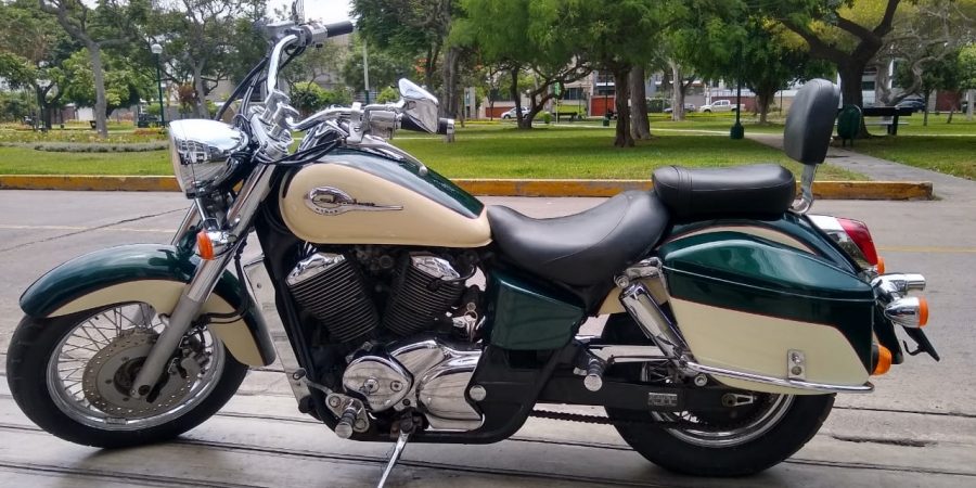 MOTOCICLETA MARCA HONDA, MODELO SHADOW, 400 CC, AÑO 1997, COLOR VERDE CREMA, 2 CILINDROS, KILOMETRAJE 27,300. VISOR ACRÍLICO, FUNDA, CASCO, GUANTES, CHALECO.