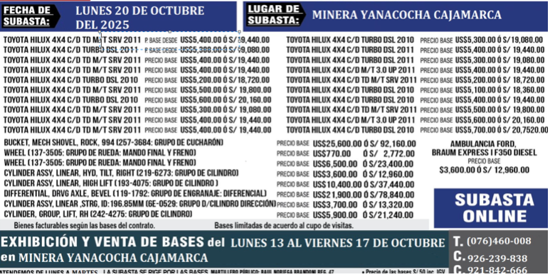 ESTÁ CIRCULANDO POR LA REDES SOCIALES UN AVISO DE GRAN SUBASTA DE 20 CAMIONETAS, 1 AMBULANCIA Y EQUIPOS MINEROS DE YANACOCHA POR ENCARGO DE NEWMONT, CON FECHA DE SUBASTA LUNES 20 OCTUBRE DEL 2025.