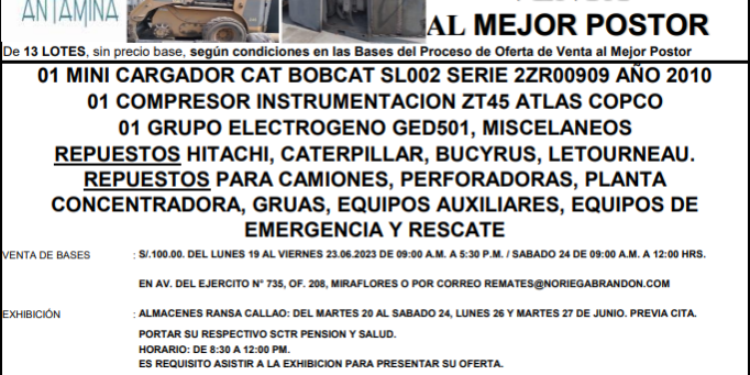 Jun152023MaquinariasOFERTA DE VENTA AL MEJOR POSTOR COMPAÑÍA MINERA ANTAMINA S.A. LUNES 03 DE JULIO Categoría: MaquinariasPor noriegabrandon15 de junio de 2023 Compartir esta publicación Share on WhatsAppShare on WhatsApp Autor: noriegabrandon http://www.noriegabrandon.com Navegación entre publicacionesAnteriorPublicación anterior:SUBASTA EXTRAJUDICIAL DE INMUEBLE AGRICOLA – SEGUNDA CONVOCATORIA – MARTES 27 JUN. 2023 – 12HRSSiguientePublicación siguiente:SUBASTA PERUANAS – JUEVES 20 DE JULIO 2023 – 10:30 A.M.Related PostsGRAN SUBASTA DE VEHICULOS Y MAQUINARIAS24 de noviembre de 2025CONCURSO DE VENTA DE REPUESTOS VARIOS – MINERA CHINALCO – LUNES 20 DE OCTUBRE DEL 20256 de octubre de 2025SUBASTA AL MEJOR POSTOR DE MAQUINARIAS Y EQUIPOS – POSADA PERU – JUEVES 23 DE OCTUBRE DEL 2025 20256 de octubre de 2025GRAN SUBASTA DE VEHICULOS Y EQUIPOS INDUSTRIALES – MIERCOLES 07 DE MAYO DEL 2025 – 10:30 A.M.28 de abril de 2025VENTA PÚBLICA PRESENCIAL PETROPERU TALARA VIERNES 09 DE MAYO 8:30 A.M.21 de abril de 2025GRAN SUBASTA DE CAMIONETAS, CAMION Y EQUIPOS – MARTES 29 DE ABRIL 2025 – 10:30 A.M.14 de abril de 2025