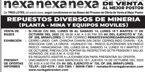 OFERTA DE VENTA AL MEJOR POSTOR NEXA RESOURCES CAJAMARQUILLA S.A. VIERNES 20 OCTUBRE 2023