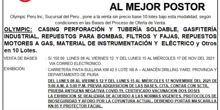 Nov92021OtrosCategoría: OtrosPor noriegabrandon9 de noviembre de 2021 Compartir esta publicación Share on WhatsAppShare on WhatsApp Autor: noriegabrandon http://www.noriegabrandon.com Navegación entre publicacionesAnteriorPublicación anterior:SUBASTA PUBLICA NEWMONT PERUSiguientePublicación siguiente:OFERTA DE VENTA AL MEJOR POSTOR POR ENCARGO DE ZEUS ENERGY – LUNES 22 NOVIEMBRE 2021Related PostsGRAN SUBASTA PÚBLICA DE REPUESTOS AL BARRER // MODALIDAD OFERTAS EN SOBRE CERRADO CON POSIBILIDAD DE MEJORAMIENTO A VIVA VOZ PRESENCIAL Y VIRTUAL – VIERNES 28 DE NOV. 2025 – 11:00 AM.10 de noviembre de 2025SUBASTA AL MEJOR POSTOR DE MAQUINARIAS Y EQUIPOS – POSADA PERU – JUEVES 23 DE OCTUBRE DEL 2025 20256 de octubre de 2025GRAN SUBASTA DE VEHICULOS Y EQUIPOS INDUSTRIALES POR ENCARGO DE ENTIDAD FINANCIERA – MIERCOLES 17 DE SETIEMBRE A LAS 10.30 AM5 de septiembre de 2025VENTA PÚBLICA PRESENCIAL PETROPERU TALARA VIERNES 09 DE MAYO 8:30 A.M.21 de abril de 2025CONCURSO DE VENTA DE EQUIPOS AL PESO – COPEINCA – MIERCOLES 19 DE MARZO DEL 20253 de marzo de 2025GRAN SUBASTA ELECTRONICA DE 03 LOTES DE MATERIALES Y REPUESTOS POR ENCARGO DE COPEINCA Y CFG – MARTES 19 DE DICIEMBRE A LAS 10:30 A.M.12 de diciembre de 2023