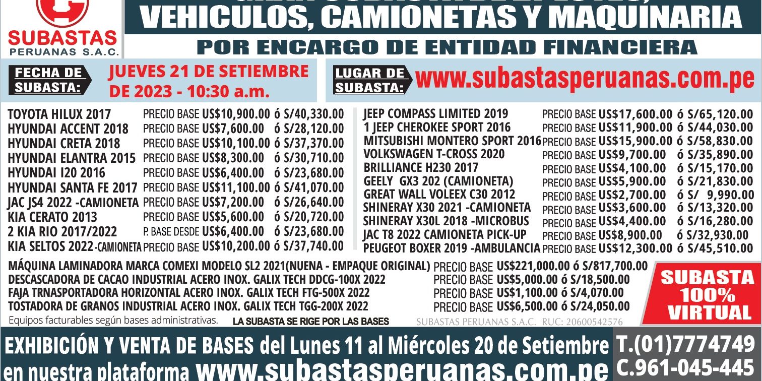 Sep122023VehículosSUBASTA PERUANAS – JUEVES 21 DE SETIEMBRE 2023 – 10:30 A.M. Categoría: VehículosPor noriegabrandon12 de septiembre de 2023 Compartir esta publicación Share on WhatsAppShare on WhatsApp Autor: noriegabrandon http://www.noriegabrandon.com Navegación entre publicacionesAnteriorPublicación anterior:SUBASTA AL MEJOR POSTOR – VOLCAN CIA. MINERA S.A.A. / CIA. MINERA CHUNGAR S.A.C. / EMP. ADM. CERRO S.A.C. – JUEVES 05 DE OCTUBRE DEL 2023SiguientePublicación siguiente:SUBASTA PUBLICA N° 002-2023 – TERCERA CONVOCATORIA – UN INMUEBLE – MARINA DE GUERRA DEL PERU – JUEVES 04 DE OCTUBRE 2023 A LAS 11:00 A.M.Related PostsGRAN SUBASTA DE VEHICULOS Y MAQUINARIAS24 de noviembre de 2025COMUNICADO DE ESTAFA16 de octubre de 2025¡NO SE DEJEN SORPRENDER! ¡ESTE AVISO ES UNA ESTAFA!16 de octubre de 2025GRAN SUBASTA DE 20 CAMIONETAS, AMBULANCIA Y EQUIPOS MINEROS – MIERCOLES 17 DE SETIEMBRE 2025 A LAS 12:00 HRS.5 de septiembre de 2025GRAN SUBASTA DE VEHICULOS Y EQUIPOS INDUSTRIALES POR ENCARGO DE ENTIDAD FINANCIERA – MIERCOLES 17 DE SETIEMBRE A LAS 10.30 AM5 de septiembre de 2025GRAN SUBASTA DE VEHICULOS Y EQUIPOS INDUSTRIALES – MIERCOLES 07 DE MAYO DEL 2025 – 10:30 A.M.28 de abril de 2025