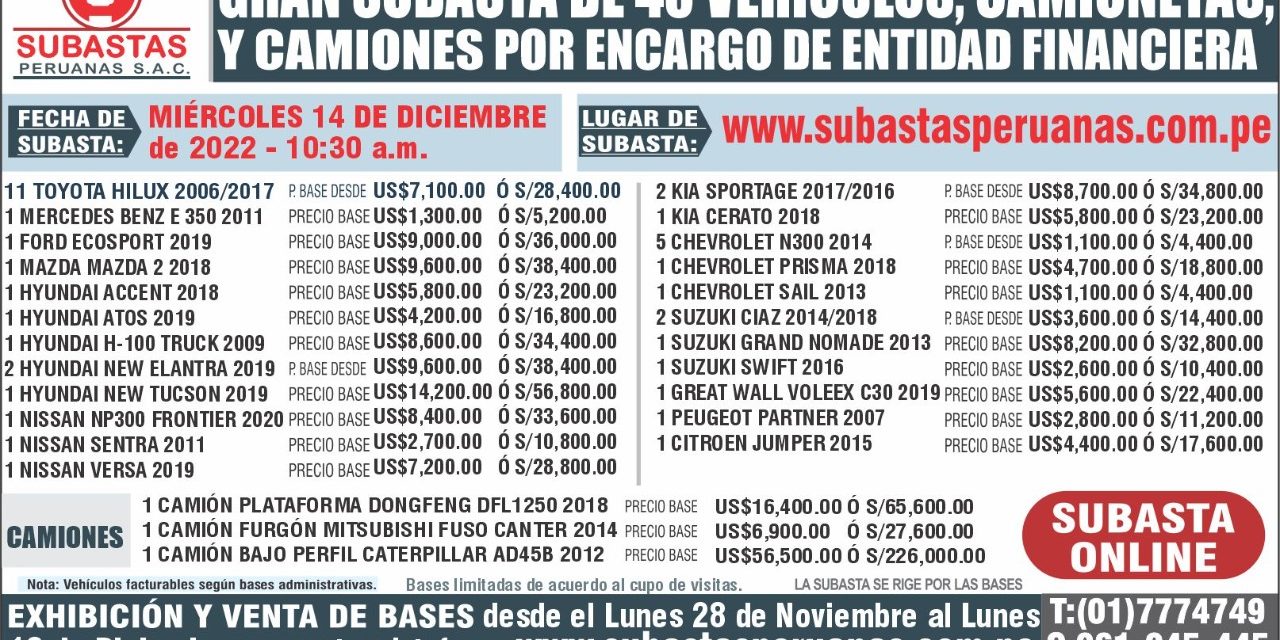 Dic12022VehículosSUBASTA PERUANAS – MIERCOLES 14 DE DICIEMBRE 2022 – 10:30 A.M. Categoría: VehículosPor noriegabrandon1 de diciembre de 2022 Compartir esta publicación Share on WhatsAppShare on WhatsApp Autor: noriegabrandon http://www.noriegabrandon.com Navegación entre publicacionesAnteriorPublicación anterior:SUBASTA PUBLICA N° 001-2022-EMILIMA-FOMUR – SABADO 26 DE NOVIEMBRE 2022 – 11:00 A.MSiguientePublicación siguiente:SUBASTA AL MEJOR POSTOR POR ENCARGO DE GRUPO EXITO S.A.C. MARTES 25 DE ABRIL 2023 11:30 A.M.Related PostsCOMUNICADO DE ESTAFA16 de octubre de 2025¡NO SE DEJEN SORPRENDER! ¡ESTE AVISO ES UNA ESTAFA!16 de octubre de 2025GRAN SUBASTA DE 20 CAMIONETAS, AMBULANCIA Y EQUIPOS MINEROS – MIERCOLES 17 DE SETIEMBRE 2025 A LAS 12:00 HRS.5 de septiembre de 2025GRAN SUBASTA DE VEHICULOS Y EQUIPOS INDUSTRIALES POR ENCARGO DE ENTIDAD FINANCIERA – MIERCOLES 17 DE SETIEMBRE A LAS 10.30 AM5 de septiembre de 2025GRAN SUBASTA DE VEHICULOS Y EQUIPOS INDUSTRIALES – MIERCOLES 07 DE MAYO DEL 2025 – 10:30 A.M.28 de abril de 2025VENTA PÚBLICA PRESENCIAL PETROPERU TALARA VIERNES 09 DE MAYO 8:30 A.M.21 de abril de 2025