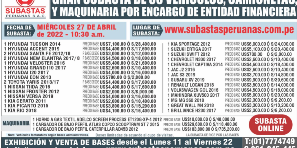 SUBASTA PERUANAS – MIERCOLES 27 DE ABRIL 2022 – 10:30 A.M.