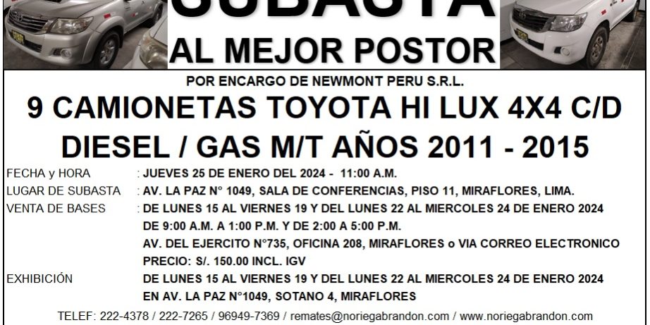 SUBASTA PUBLICA DE 09 CAMIONETAS POR ENCARGO DE NEWMONT PERU S.R.L. JUEVES 25 DE ENERO 11:00 A.M. RELACION DE UNIDADES