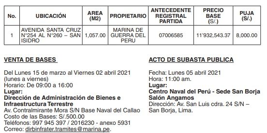 Mar182021InmueblesCategoría: InmueblesPor noriegabrandon18 de marzo de 2021 Compartir esta publicación Share on WhatsAppShare on WhatsApp Autor: noriegabrandon http://www.noriegabrandon.com Navegación entre publicacionesAnteriorPublicación anterior:GRAN SUBASTA ONLINE DE 52 VEHICULOS, CAMIONES Y MAQUINARIASiguientePublicación siguiente:GRAN SUBASTA ONLINE DE 35 LOTES OMNIBUSES, VEHICULOS, MOTOCICLETAS Y GRUPOS ELECTROGENOSRelated PostsGRAN SUBASTA PUBLICA DE TERRENOS SERPAR – 17 LOTES EN 9 DISTRITOS DE LIMA JUEVES 13 DE NOVIEMBRE 2025 – 09:00 A.M.10 de octubre de 2025SUBASTA PUBLICA DE TERRENOS DE SERPAR – MARTES 16 DE SETIEMBRE DEL 2025 – 9:00 AM20 de agosto de 2025SUBASTA PUBLICA DE INMUEBLES – GRUPO SCOTIABANK 14-08-202530 de julio de 2025SUBASTA PUBLICA DE TERRENOS – EMILIMA – LUNES 23 DE JUNIO 2025 11:00 a.m.19 de junio de 2025GRAN SUBASTA PUBLICA DE INMUEBLES – GRUPO SCOTIABANK PERU – MIERCOLES 11 DE JUNIO A LAS 11:00 HORAS19 de mayo de 2025GRAN SUBASTA PUBLICA EMILIMA 2025 – 8 LOTES DE TERRENOS – DOMINGO 25 DE MAYO 2025 – 09:00 A.M.15 de mayo de 2025