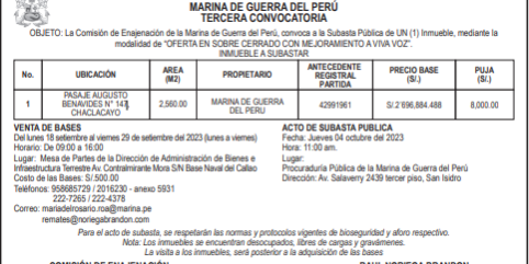 Sep152023InmueblesSUBASTA PUBLICA N° 002-2023 – TERCERA CONVOCATORIA – UN INMUEBLE – MARINA DE GUERRA DEL PERU – JUEVES 04 DE OCTUBRE 2023 A LAS 11:00 A.M. Categoría: InmueblesPor noriegabrandon15 de septiembre de 2023 Compartir esta publicación Share on WhatsAppShare on WhatsApp Autor: noriegabrandon http://www.noriegabrandon.com Navegación entre publicacionesAnteriorPublicación anterior:SUBASTA PERUANAS – JUEVES 21 DE SETIEMBRE 2023 – 10:30 A.M.SiguientePublicación siguiente:OFERTA DE VENTA AL MEJOR POSTOR NEXA RESOURCES CAJAMARQUILLA S.A. VIERNES 13 OCTUBRE 2023Related PostsGRAN SUBASTA PUBLICA DE TERRENOS SERPAR – 17 LOTES EN 9 DISTRITOS DE LIMA JUEVES 13 DE NOVIEMBRE 2025 – 09:00 A.M.10 de octubre de 2025SUBASTA PUBLICA DE TERRENOS DE SERPAR – MARTES 16 DE SETIEMBRE DEL 2025 – 9:00 AM20 de agosto de 2025SUBASTA PUBLICA DE INMUEBLES – GRUPO SCOTIABANK 14-08-202530 de julio de 2025SUBASTA PUBLICA DE TERRENOS – EMILIMA – LUNES 23 DE JUNIO 2025 11:00 a.m.19 de junio de 2025GRAN SUBASTA PUBLICA DE INMUEBLES – GRUPO SCOTIABANK PERU – MIERCOLES 11 DE JUNIO A LAS 11:00 HORAS19 de mayo de 2025GRAN SUBASTA PUBLICA EMILIMA 2025 – 8 LOTES DE TERRENOS – DOMINGO 25 DE MAYO 2025 – 09:00 A.M.15 de mayo de 2025
