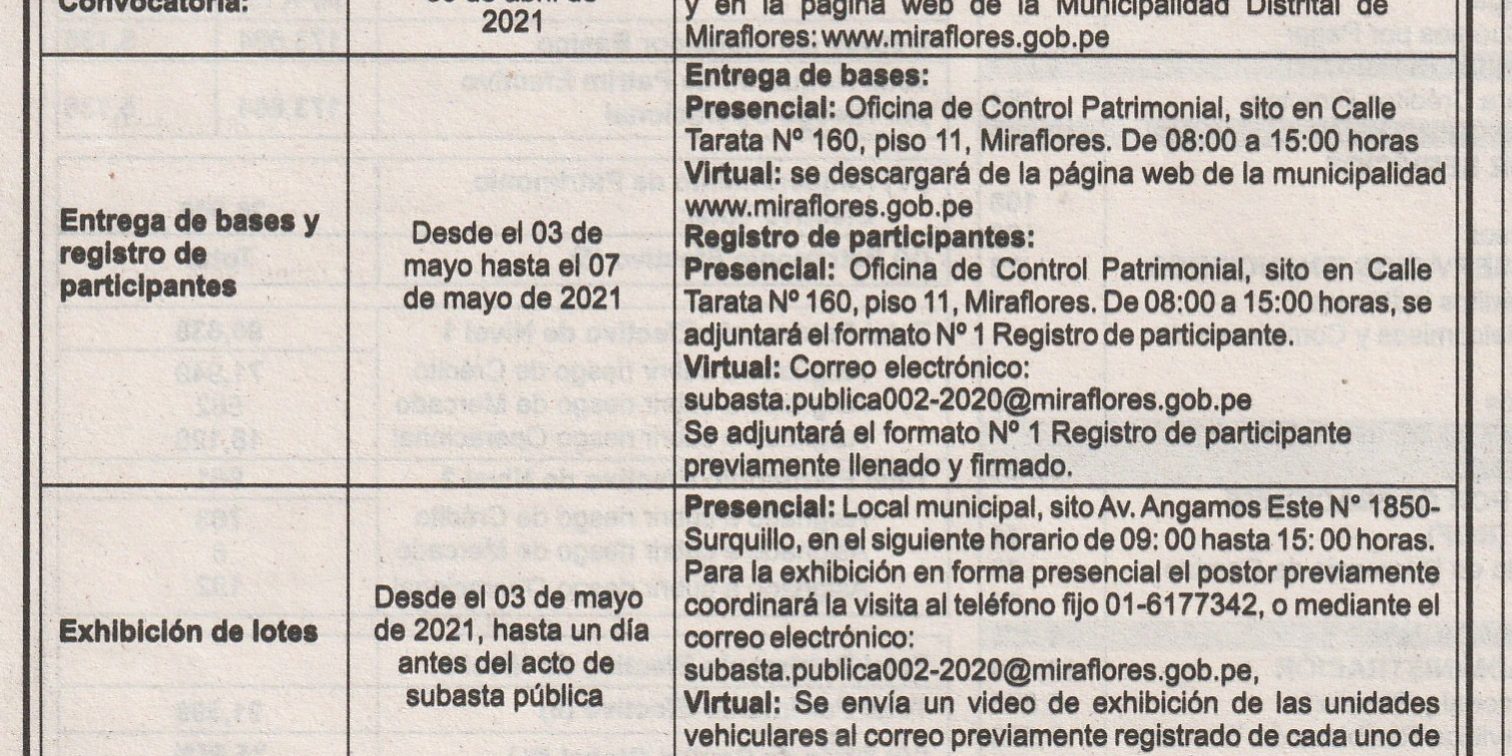 SUBASTA PÚBLICA Nº 002-2020-MM / MUNICIPALIDAD DE MIRAFLORES – 14 DE MAYO