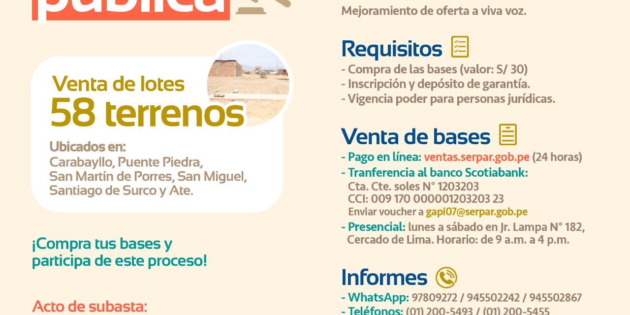 GRAN SUBASTA PUBLICA DE TERRENOS SERPAR – 17 LOTES EN 9 DISTRITOS DE LIMA JUEVES 13 DE NOVIEMBRE 2025 – 09:00 A.M.10 de octubre de 2025